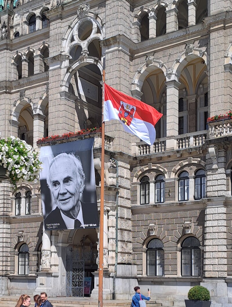 Vlajkovou výzdobu liberecké radnice zaznamenává fotografie z prezidentské návštěvy Liberce Dr. Edvarda Beneše s chotí v roce 1936. Současně tenkrát navštívili i liberecké výstavní trhy. Na snímku vlevo jsou dva československé prapory a vpravo dva modré městské prapory Liberce se znakem.