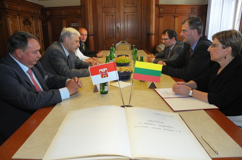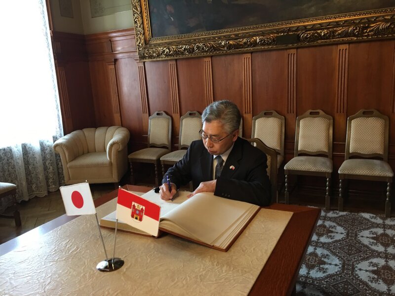 Stolní státní praporky Německa, Japonska a Litvy doprovází městský praporek Liberce