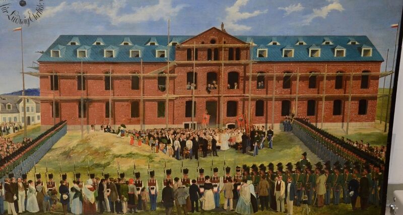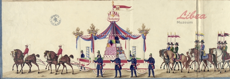 Pozn.: Označení na stuze "Armenhaus", čili "chudobinec" neodpovídá skutečnému užívání této významné empírové budovy. Liberecká Střelnice byla postavena v roce 1831 jako nové a reprezentační sídlo libereckých Střelců (později Ostrostřelců), jejichž kořeny, jakožto součásti městské domobrany, sahají až do začátku 16. století.