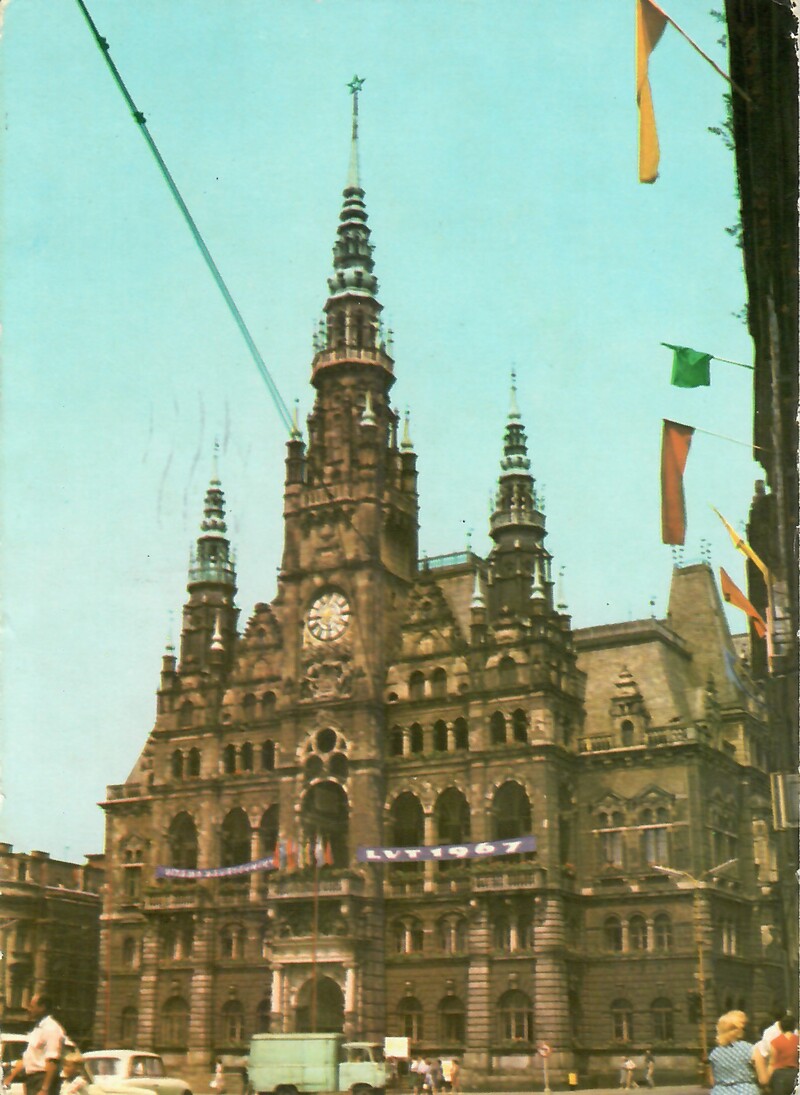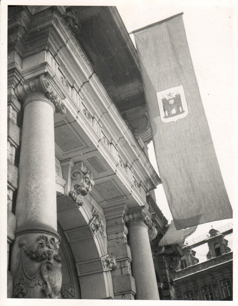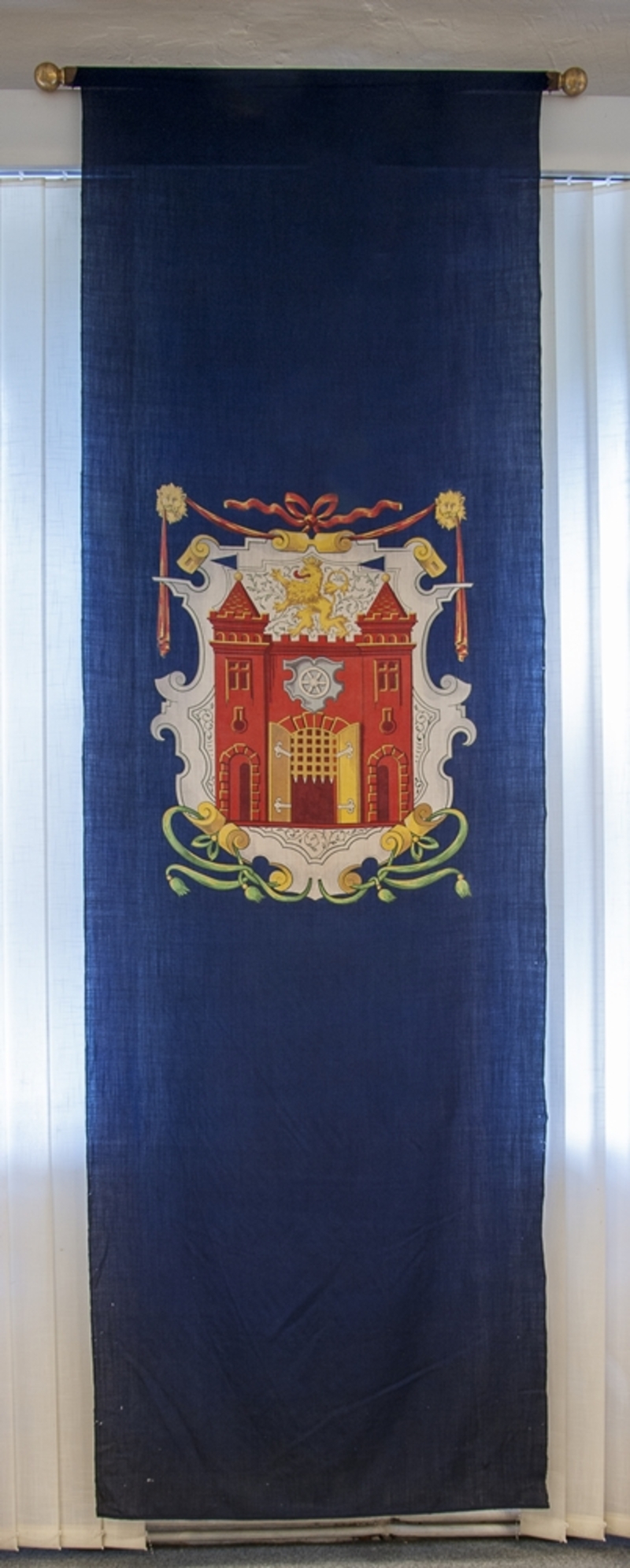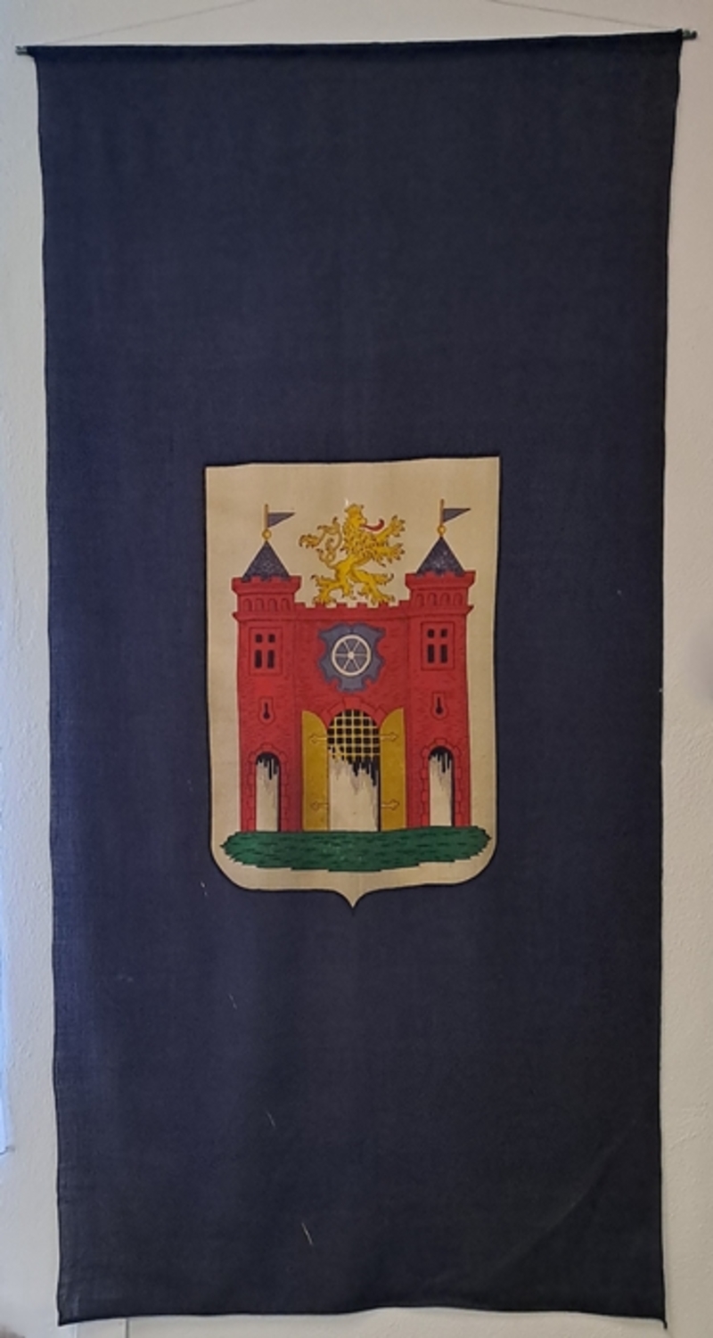 Modrý prapor se znakem Liberce vyvěšený na liberecké radnici ještě do roku 1953 (foto poskytl sběratel Egon Wiener)