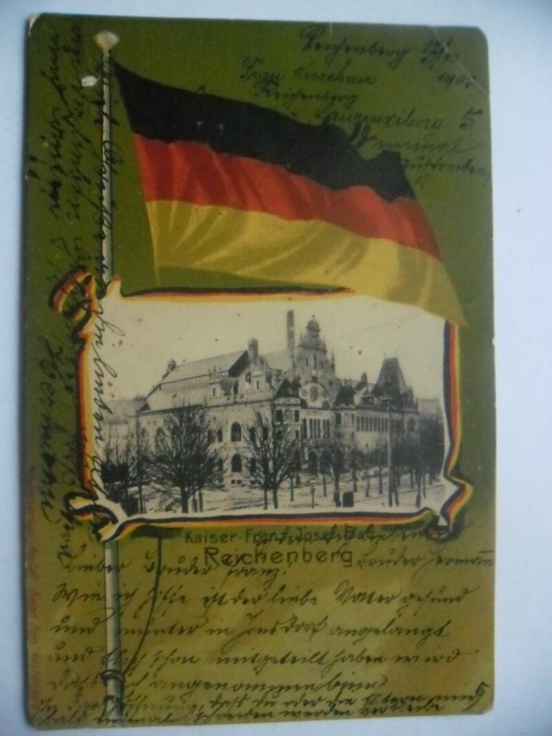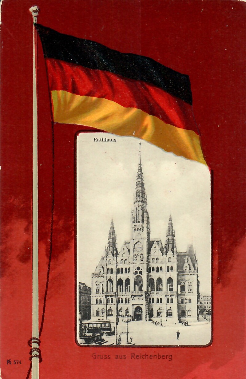 Po roce 1848 se v Liberci rozšířilo také používání černo-červeno-žlutých vlajek zejména mezi německým obyvatelstvem. Dokladem je již uvedený střelecký štít Josefa Elsnera z roku 1852 výše. Jejich užívání potvrzují i dobové pohlednice nebo novinové články popisující vlajkovou výzdobu při významných událostech. Příklad německo-české výstavy v roce 1906 v Liberci je uveden níže.
