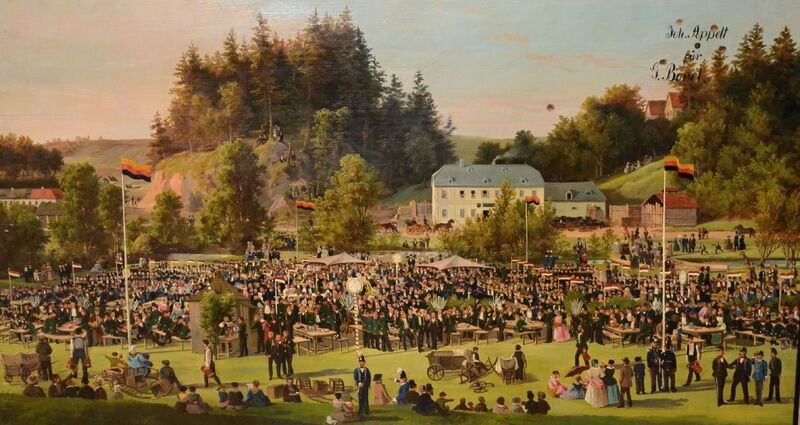O sedm let později, v roce 1852, namaloval Josef Elsner střelecký terč s názvem “Tábor národní gardy v Liberci”. Vyjadřuje davovou scénu s uniformovanými členy národní gardy a civilisty před zájezdní hospodou. Nad stoly mužstva je namalováno 31 menších červeno-bílých praporů. V popředí se tyčí čtyři vysoké stožáry se žluto-červeno-černými vlajkami. Tento střelecký štít má zachycovat čtyři roky starou událost z 10. září revolučního roku 1848.