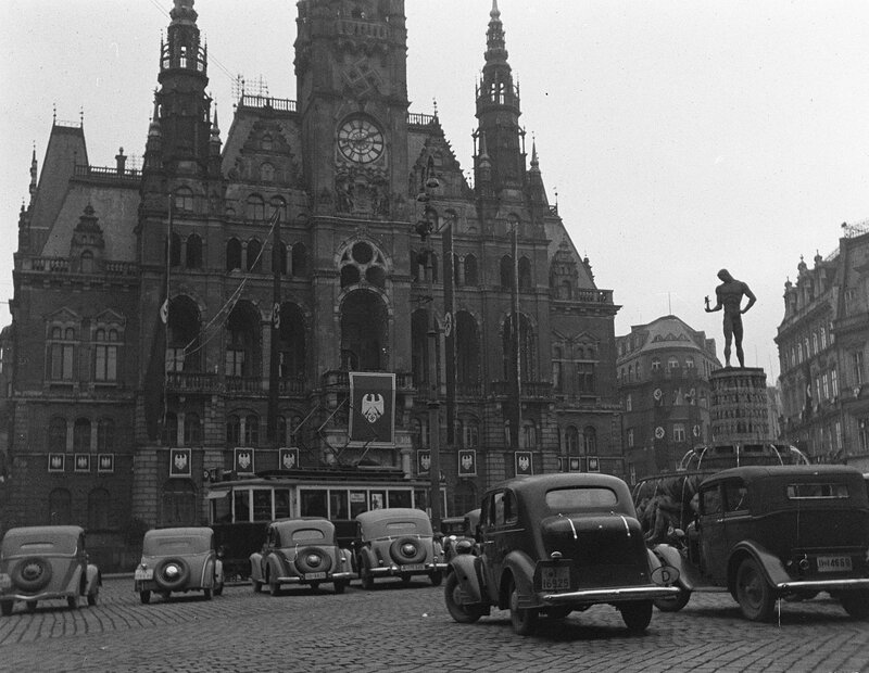 Ponuré snímky radnice, protější strany radničního náměstí a dolního náměstí z let 1939 až 1945