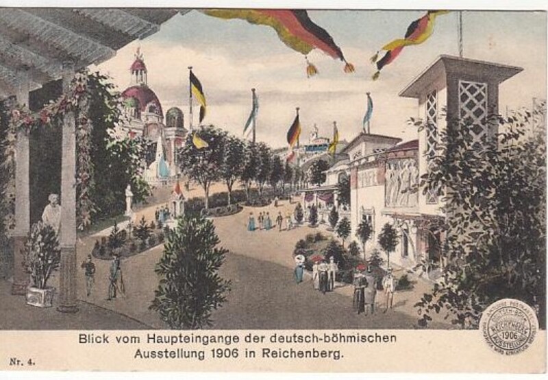 Užití modro-bílé vlajky při německo-české výstavě v Liberci v roce 1906 dokládá kolorovaná pohlednice z prostoru od hlavního vchodu výstaviště. Vedle císařských černo-žlutých a všeněmeckých černo-červeno-žlutých barev jsou na fotografii zřetelné také dvě modro-bílé vlajky zastupující městské barvy Reichenbergu. Zdá se celkem jasné, že na tak prestižní akci německých Čechů se červeno-bílými vlajkami prezentovat nemohli.