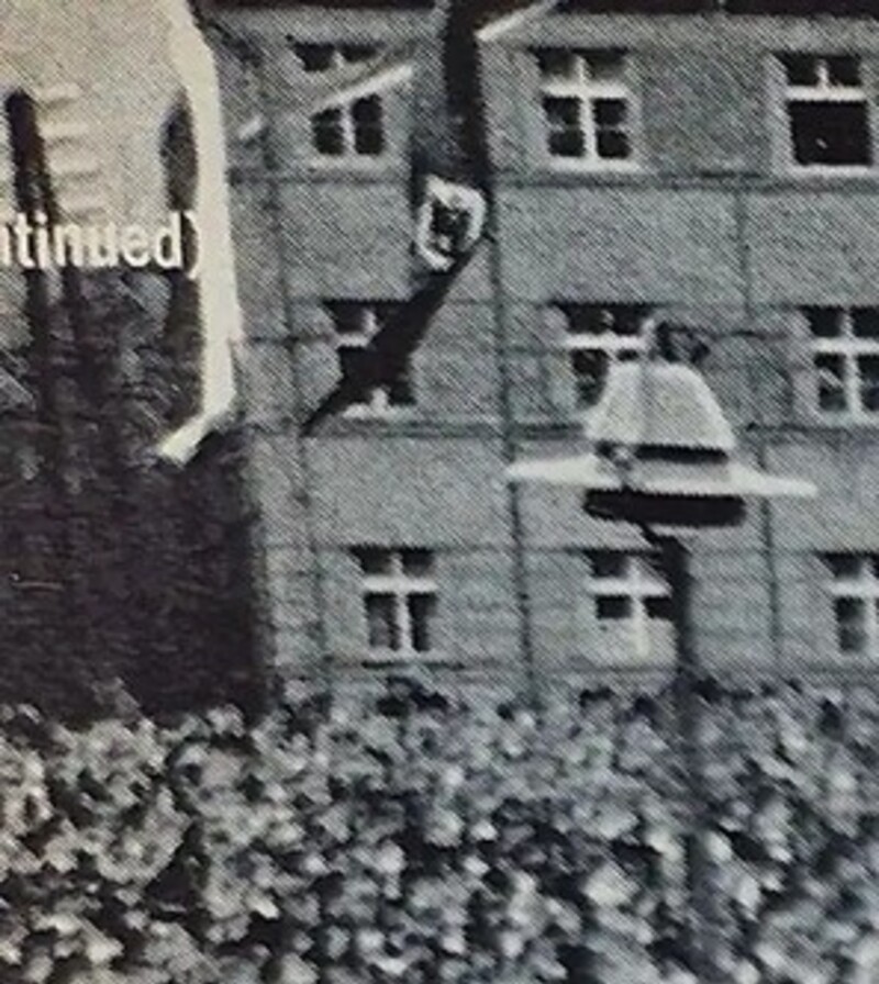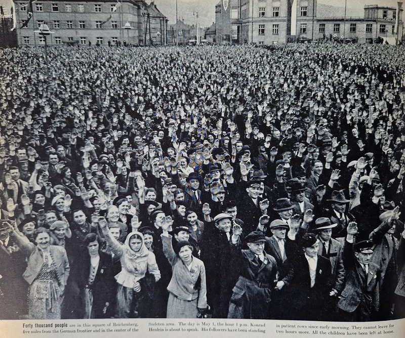 Městská korouhev zachycená na fotografii ze shromáždění asi 40.000 sudetských Němců v Liberci 1. 5. 1938, ke kterým tehdy promlouval Konrad Henlein. Demonstrující se vztyčenými pažemi hlásili k německému nacionalismu. Zdroj: americký časopis LIFE, 30. 5. 1938 (zkresleno díky zvětšení)
