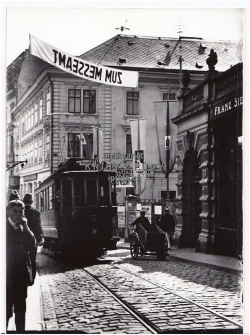 Dobová fotografie z počátků 20. století s modrou městskou korouhví se znakem města Liberce