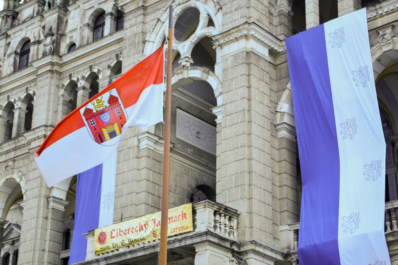 Městské vlajky Liberce před radnicí a stadionem U Nisy