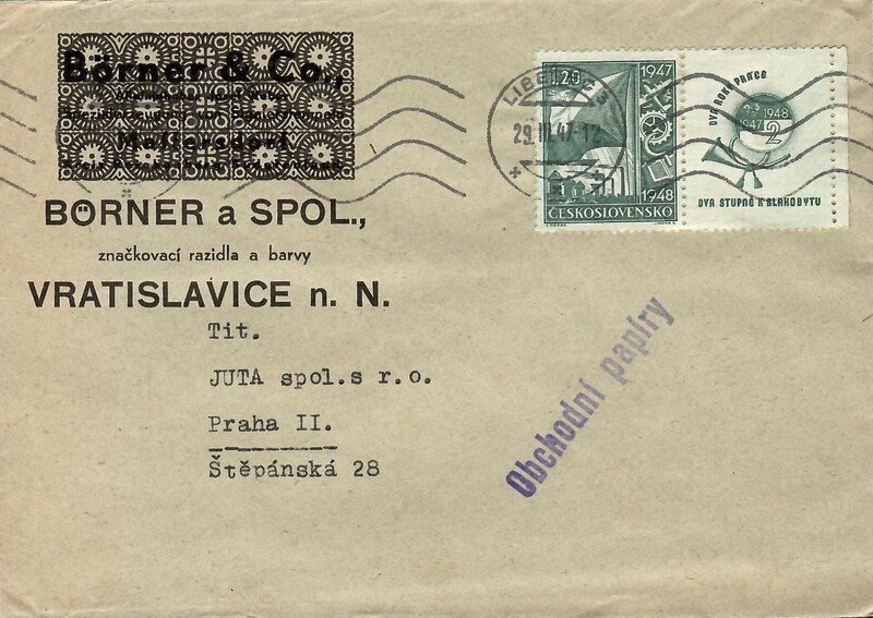 Firemní obálka BÖRNER a SPOL, VRATISLAVICE n. N. s podacím razítkem pošty v Liberci 3 potvrzuje existenci firmy k 29. 3. 1947.